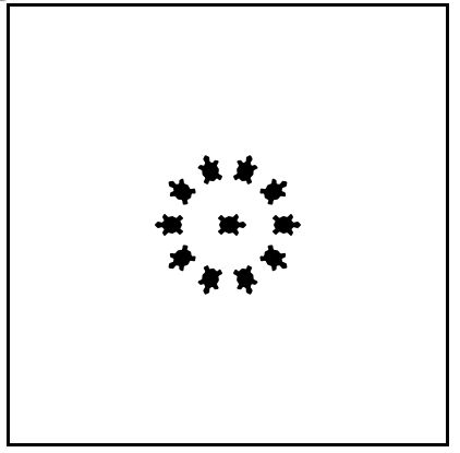 The following program uses the stamp method to create a circle of turtle shapes as shown to the left, but the lines are mixed up. The program should do all necessary set-up, create the turtle, set the shape to “turtle”, and pick up the pen. Then the turtle should repeat the following ten times: go forward 50 pixels, leave a copy of the turtle at the current position, reverse for 50 pixels, and then turn right 36 degrees.